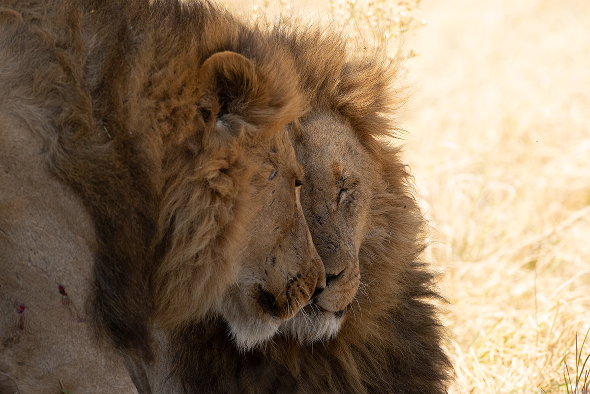 two male lions rubbing their faces together