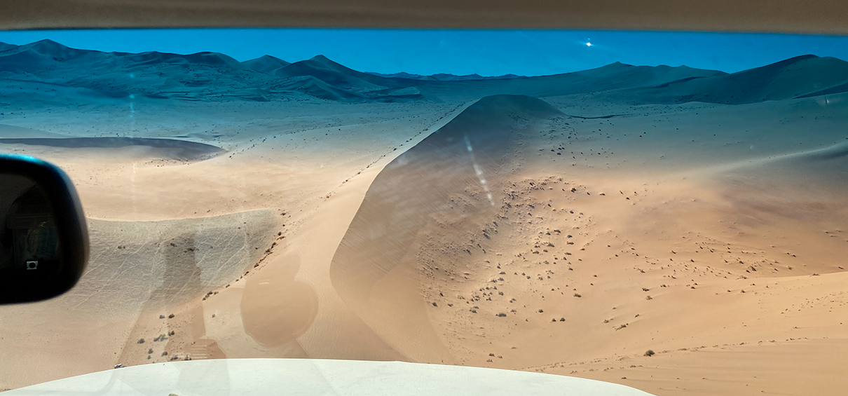 view from the crest of a dune with the vehicles in the distance